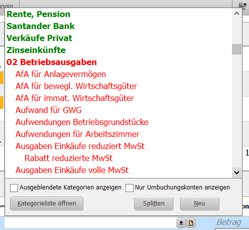 | michahoernchen (Normaler Nutzer) Hallo, irgendwie vermisse ich beim Zuordnen, trotz, dass ich die neue AutoFill Funktion echt gut finde und nutze, trotzdem die übersichtlich nach Einnahmen, Ausgaben und Umbuchung sortierte Kategorienliste. Siehe Foto aus der JV. Würde denn beides programmierbar sein? Also Autofill und sortierte Kategorienliste wie in JV? Wer würde sich das auch wünschen? ![]() |
