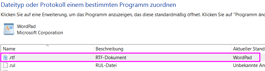 Super, Danke. vor dem .rtf ist das Word-Symbol. In der nächsten Spalte steht "Rich Text Format" und ganz hinten "Microsoft Word". Das ist nicht ganz richtig, oder? Wenn ich auf Programm ändern gehe, kann ich ausser Microsoft Word online ein Programm suchen. Es tut mir leid, wenn ich so unwissend rüberkomme, aber ich habe Win10 erst seit Samstag und komme mit manchen Sachen nicht klar.