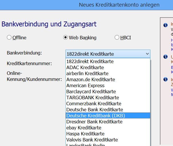 In der Vergangenheit klappte die Online-Verbindung zur DKB, wenn auch nicht problemlos. Einzelne Kontoumsätze wurden immer einmal "vergessen". Nach der Neuinstallation will mir aber die Verbindung zu dem Kreditkartenkonto nicht mehr gelingen, zu dem dortigen Girokonto allerdings schon.