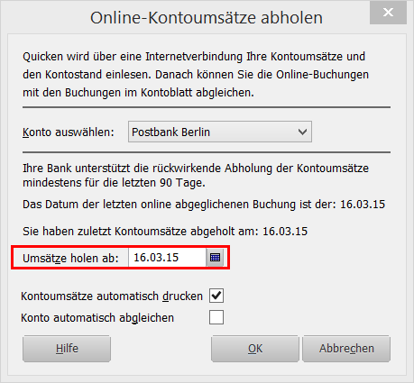 nein. Quicken holt je nach Einstellung die Umsätze entweder ab dem Tag der letzten abgeglichenen Buchung oder dem Tag der letzten Umsatzabholung.