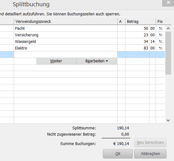 ich weiss nicht wie das miteinander zusammenhängt, aber mir ist eben noch aufgefallen: wenn ich in die splittbuchung nochmal reingehe dann werden die zahlen (2stück) in rot und mit minus dargestellt, was ja auch richtig ist. aber darunter steht die positive zahl als summe beider als normale pluszahl da. sodaß null rauskommt. was ja unlogisch ist, da die abgebuchte zahl definitiv negativ ist und nicht null