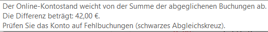 Der Online Kontostand weicht von der Summe der abgeglichenen Buchungen ab. Da steht ein schwarzes Ausrufezeichen im roten Warndreieck.