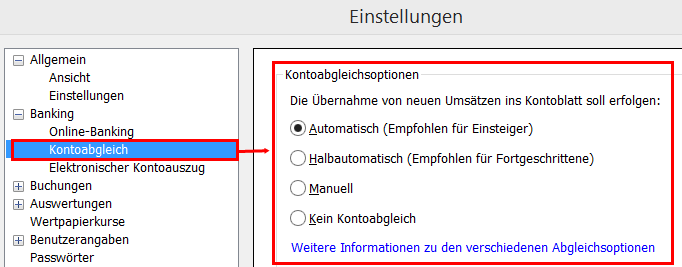Was auf einen fehlerhaften Kontoabgleich hindeutet. Welche Abgleichart ist eingestellt?
