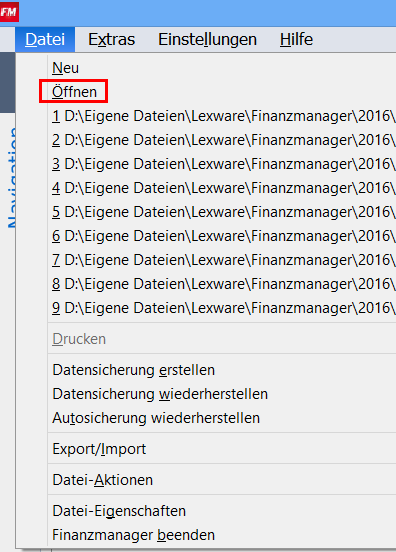 Hallo. Bei mir gibt es kein Datei=öffnen !! Wenn ich auf auf "Datei" gehe, steht da Drucken Export/import Datei-Eigenschaften Finanz Manager beenden. Mehr steht da nicht. Vielleicht versteht man ja nun das ich mit dem Programm nicht so zufrieden bin, denn es gibt hier wenige einstell möglichkeiten. mfg.