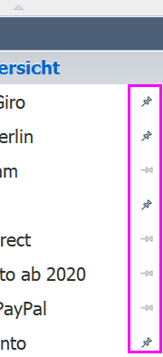 danke für die Info. Komisch ist trotzdem, dass nicht alle angezeigten Konten in der Übersicht angepinnt sind. Ein weiteres Konto wurde angezeigt, dass nicht mal in der Übersicht aufgeführt wurde. Erst nachdem alle Konten abgepinnt worden waren und Fima neu gestartet war, wurde die Anzeige neu aufgebaut und angepinnt. Jetzt scheint es zu stimmen. Demzufolge ist irgendwo ein alter Eintrag hängen geblieben.